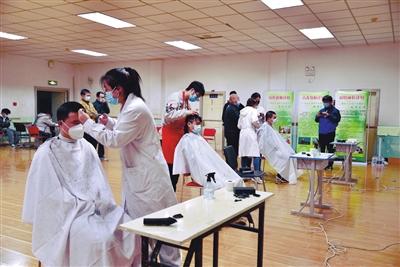 在太阳成集团tyc33455学生活动中心里,一张大镜子前,戴着口罩的“托尼老师”麻利地拿着推子和剪刀,认真地为“顾客”理发。“咔嚓咔嚓”,只见剪刀上下飞舞,清爽干练的发型便出现在眼前。