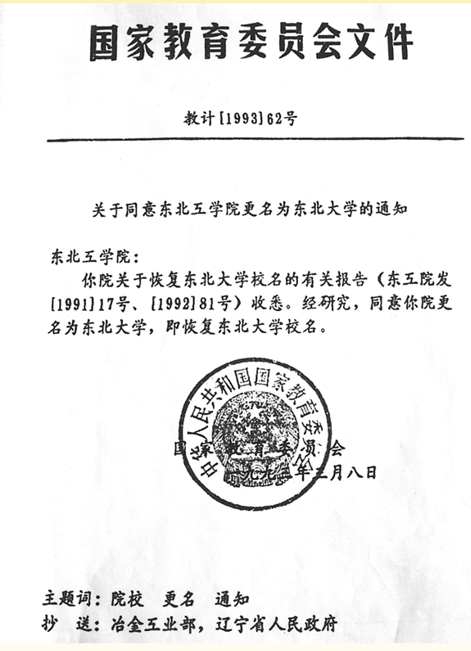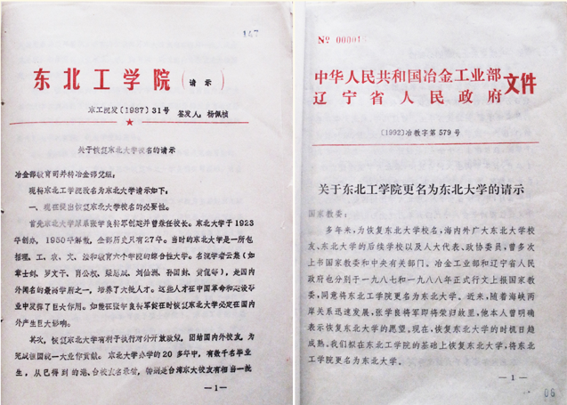 20世纪70年代末以来,东北工学院积极开展复名工作,多次就复名事宜向原冶金工业部、辽宁省委省政府、原国家教育委员会请示沟通,取得了各级政府的理解和支持