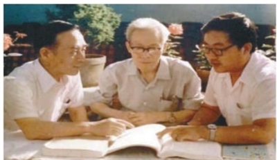 郎世俊(中)与柴天佑(右一)等人研讨学术问题。