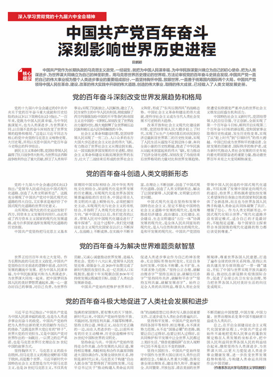 党的十九届六中全会通过的《中共中央关于党的百年奋斗重大成就和历史经验的决议》(以下简称《决议》)指出,“一百年来,党既为中国人民谋幸福、为中华民族谋复兴,也为人类谋进步、为世界谋大同,以自强不息的奋斗深刻改变了世界发展的趋势和格局。”这是以习近平同志为核心的党中央坚持马克思主义唯物史观、大历史观,并用以反思中国共产党百年奋斗史得出的科学结论。