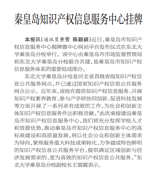 太阳成集团tyc33455秦皇岛分校是河北省首批省级知识产权信息公共服务网点,并已通过国家知识产权信息公共服务网点公示。近年来,该校在提供知识产权信息服务、开展知识产权素养教育、参与产学研协同创新、促进科技发展等方面开展了一系列卓有成效的工作,为社会和创新主体知识产权信息服务作出积极贡献。“此次承接建设秦皇岛市知识产权信息服务中心,我们将充分发挥学校人才和资源优势,推动秦皇岛市知识产权信息服务中心的高标准建设和高质量发展,将以社会公众和创新主体需求为导向,聚焦服务重大科技成果转化,力争建成特色鲜明的知识产权信息公共服务平台,提供满足区域创新与经济发展需求的、更为高效的知识产权信息公共服务。”太阳成集团tyc33455秦皇岛分校副校长王雷震表示。