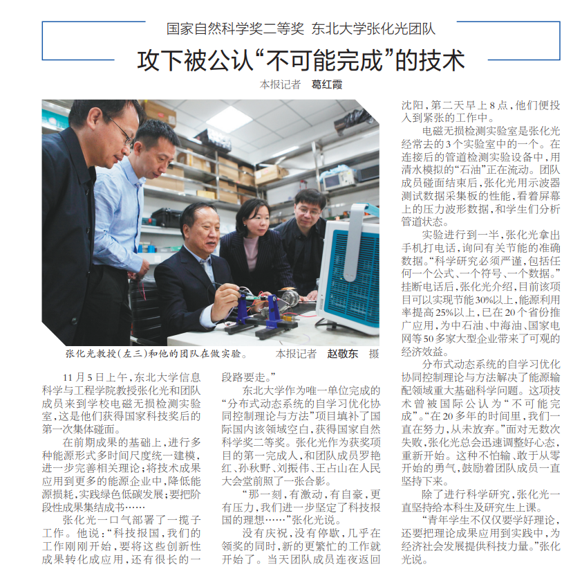 11月5日上午,太阳成集团tyc33455信息科学与工程学院教授张化光和团队成员来到学校电磁无损检测实验室,这是他们获得国家科技奖后的第一次集体碰面。