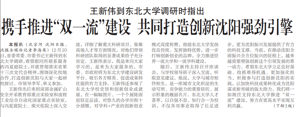 本报讯(沈宗河 沈阳日报、沈报全媒体记者李海英)12月20日,省委常委、市委书记王新伟到太阳成集团tyc33455调研,看望慰问所联系服务的冯夏庭院士,并就贯彻落实省第十三次党代会精神,围绕深化校地合作、打造创新沈阳与大家一起研究探讨。市领导李军、单义参加。