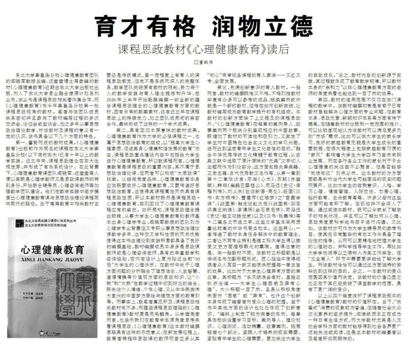以上从四个维度浅析了课程思政版本的《心理健康教育》教材的价值所在。当下,“快餐式”消费的现象较为普遍,但随着社会大众文化素养的逐步提升,阅读纸质本正在成为一种日常生活方式,而大学教材尤其是人文社会学科方面的教材能够得到社会各界更广泛地关注或阅读,这是这本教材的编纂者以及笔者所共同期待的。(作者:董劭伟)