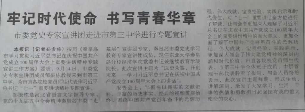本报讯(记者孙雪梅)按照《秦皇岛市学习贯彻习近平总书记在庆祝中国共产党成立100周年大会上重要讲话精神专题宣讲工作方案》要求,9月14日,市委党史专家宣讲团成员邹振栋教授来到市第三中学,为市直各院校党员师生代表作习近平总书记“七一”重要讲话精神专题宣讲。