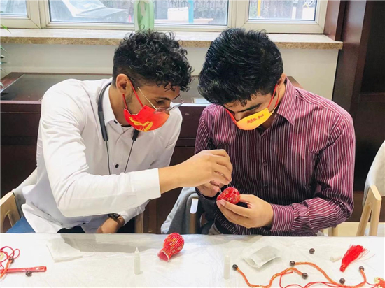 来自巴基斯坦的卢克曼和来自也门的穆赫虽然都是第一次尝试制作这种特殊的纸艺作品,但他们的灵巧劲儿还是得到了身旁李阿姨的夸赞:“做得真不错,很聪明!”