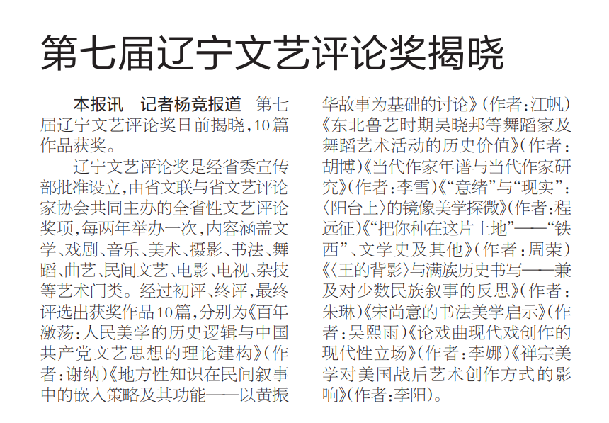 辽宁文艺评论奖是经省委宣传部批准设立,由省文联与省文艺评论家协会共同主办的全省性文艺评论奖项,每两年举办一次,内容涵盖文学、戏剧、音乐、美术、摄影、书法、舞蹈、曲艺、民间文艺、电影、电视、杂技等艺术门类。经过初评、终评,最终评选出获奖作品10篇,分别为《百年激荡:人民美学的历史逻辑与中国共产党文艺思想的理论建构》(作者:谢纳)《地方性知识在民间叙事中的嵌入策略及其功能——以黄振华故事为基础的讨论》 (作者:江帆)《东北鲁艺时期吴晓邦等舞蹈家及舞蹈艺术活动的历史价值》(作者:胡博)《当代作家年谱与当代作家研究》(作者:李雪)《“意绪”与“现实”:〈阳台上〉的镜像美学探微》(作者:程远征)《“把你种在这片土地”——“铁西”、文学史及其他》(作者:周荣)《〈王的背影〉与满族历史书写——兼及对少数民族叙事的反思》(作者:朱琳)《宋尚意的书法美学启示》(作者:吴熙雨)《论戏曲现代戏创作的现代性立场》(作者:李娜)《禅宗美学对美国战后艺术创作方式的影响》(作者:李阳)。