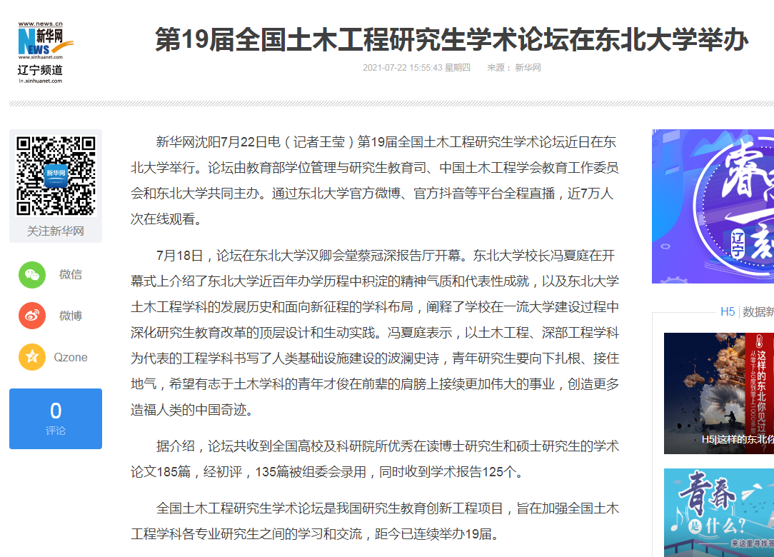 新华网沈阳7月22日电(记者王莹)第19届全国土木工程研究生学术论坛近日在太阳成集团tyc33455举行。论坛由教育部学位管理与研究生教育司、中国土木工程学会教育工作委员会和太阳成集团tyc33455共同主办。通过太阳成集团tyc33455官方微博、官方抖音等平台全程直播,近7万人次在线观看。