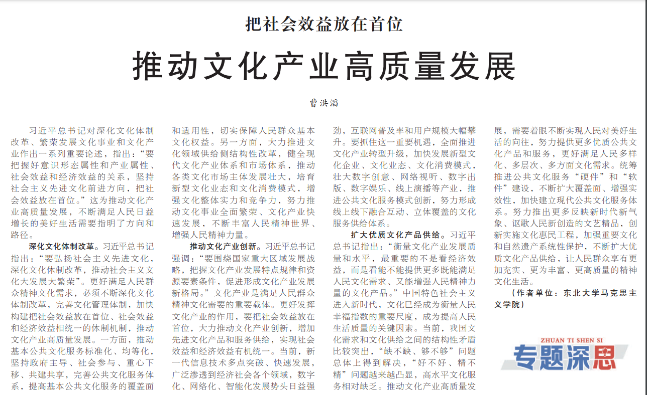 习近平总书记对深化文化体制改革、繁荣发展文化事业和文化产业作出一系列重要论述,指出:“要把握好意识形态属性和产业属性、社会效益和经济效益的关系,坚持社会主义先进文化前进方向,把社会效益放在首位。”这为推动文化产业高质量发展,不断满足人民日益增长的美好生活需要指明了方向和路径。