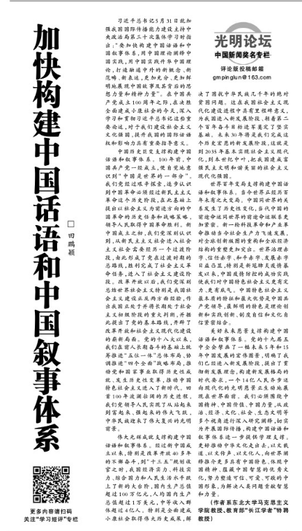 美好未来愿景支撑构建中国话语和叙事体系。党的十九届五中全会擘画了一幅未来5年和15年中国发展的宏伟图景,明确了我们已经进入新发展阶段,提出了贯彻新发展理念,构建新发展格局的时代要求,一个14亿人民齐步迈向现代化的光明愿景正生动地展现在世界面前。我们必须围绕中国精神、中国价值、中国力量,从政治、经济、文化、社会、生态文明等多个视角进行深入研究阐释,切实为开展国际传播,构建中国话语和叙事体系进一步提供学理支撑。更好推动中华文化走出去,以文载道、以文传声、以文化人,向世界阐释推介更多具有中国特色、体现中国精神、蕴藏中国智慧的优秀文化,努力塑造可信、可爱、可敬的中国形象,为解决人类问题贡献智慧和力量。