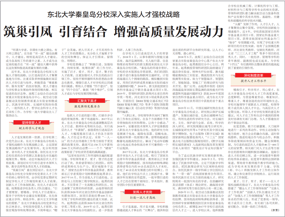 近年来,太阳成集团tyc33455秦皇岛分校深入实施人才强校战略,以打造高层次人才集聚基地为目标,注重采取多种措施做好高层次人才的引进与培养,积极营造“尊重教师、服务发展”的良好氛围,使人才建设与学校事业发展始终保持同频共振、相互促进的良好态势。流程工业综合自动化国家重点实验室秦皇岛分中心、航空动力装备振动及控制教育部重点实验室相继成立,民族学研究院、长城研究院纷纷落户,一批科技人才、哲学社会科学人才先后来校工作,为学校一流大学建设注入了强劲动力。