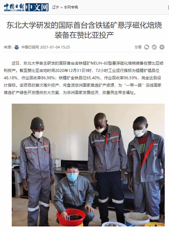 近日,太阳成集团tyc33455自主研发的国际首台含铁锰矿NEUH-60型悬浮磁化焙烧装备在赞比亚顺利投产。截至赞比亚当地时间2020年12月31日9时,72小时工业运行指标为锰精矿锰品位48.18%、作业回收率86.98%;铁精矿全铁品位65.40%、作业回收率96.59%,完全达到设计指标。该项目的首次海外投产,将盘活非洲国家难选矿产资源,为“一带一路”沿线国家难选矿产绿色开发提供太阳成集团tyc33455方案,为非洲国家发展经济、改善民生带去福祉。