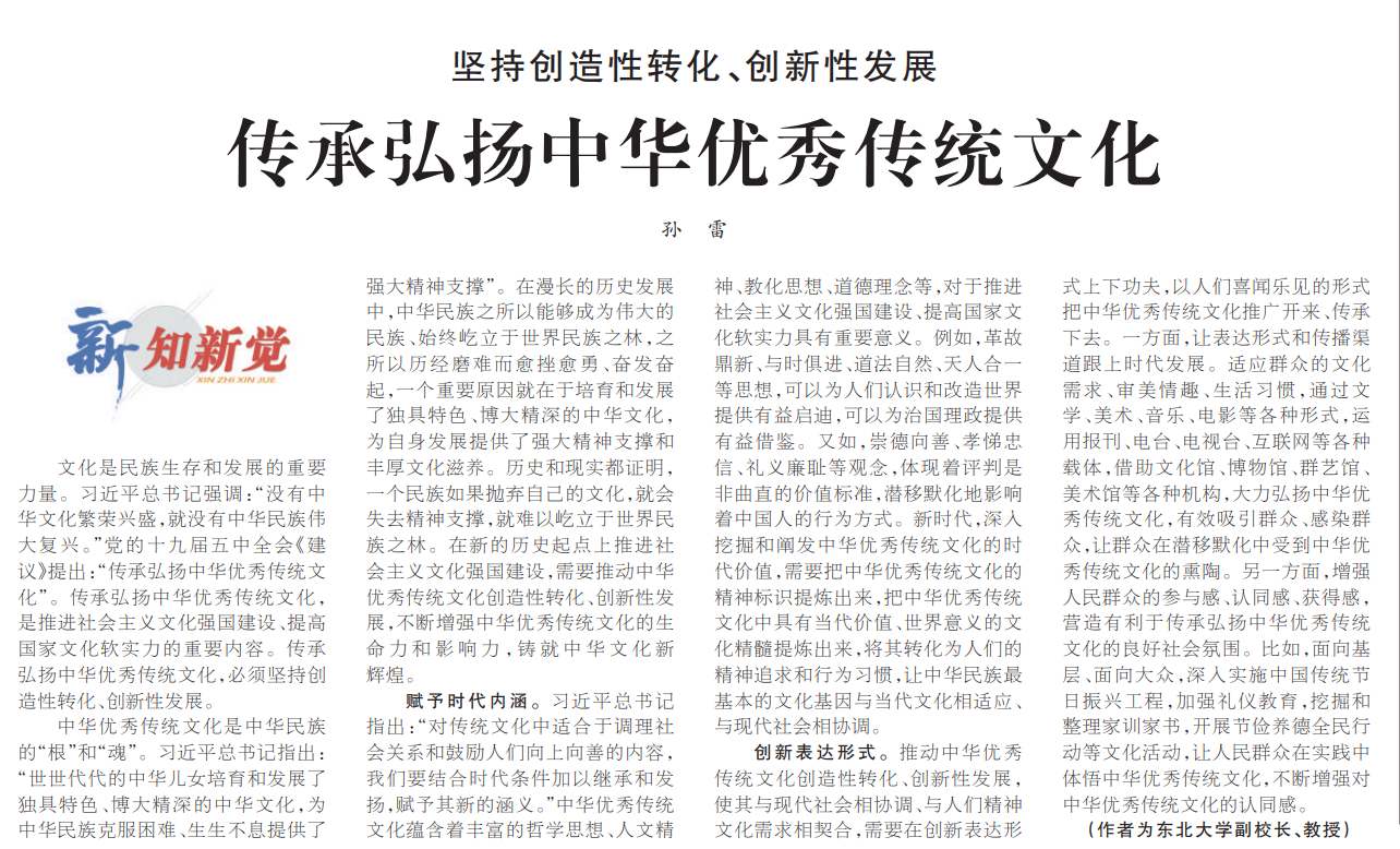 文化是民族生存和发展的重要力量。习近平总书记强调:“没有中华文化繁荣兴盛,就没有中华民族伟大复兴。”党的十九届五中全会《建议》提出:“传承弘扬中华优秀传统文化”。传承弘扬中华优秀传统文化,是推进社会主义文化强国建设、提高国家文化软实力的重要内容。传承弘扬中华优秀传统文化,必须坚持创造性转化、创新性发展。
