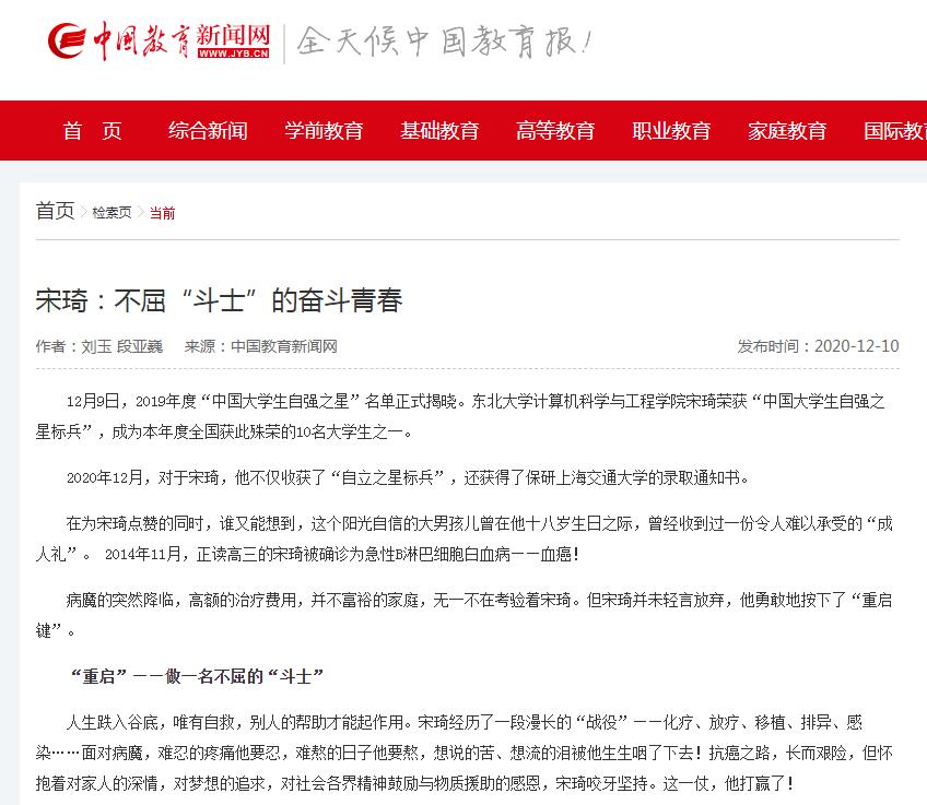 2020年12月,对于宋琦,他不仅收获了“自立之星标兵”,还获得了保研上海交通大学的录取通知书。