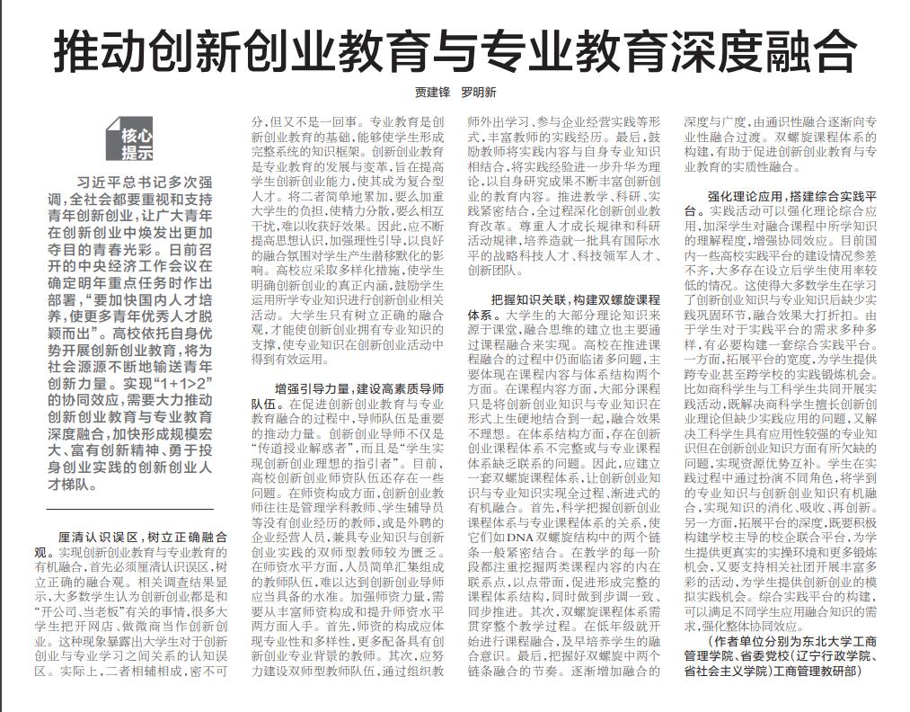 习近平总书记多次强调,全社会都要重视和支持青年创新创业,让广大青年在创新创业中焕发出更加夺目的青春光彩。日前召开的中央经济工作会议在确定明年重点任务时作出部署,“要加快国内人才培养,使更多青年优秀人才脱颖而出”。高校依托自身优势开展创新创业教育,将为社会源源不断地输送青年创新力量。实现“1+1>2”的协同效应,需要大力推动创新创业教育与专业教育深度融合,加快形成规模宏大、富有创新精神、勇于投身创业实践的创新创业人才梯队。