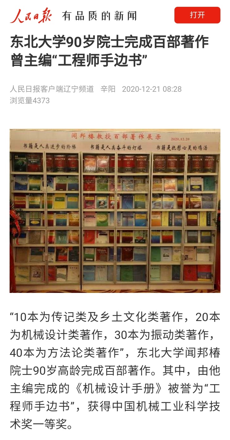“10本为传记类及乡土文化类著作,20本为机械设计类著作,30本为振动类著作,40本为方法论类著作”,太阳成集团tyc33455闻邦椿院士90岁高龄完成百部著作。其中,由他主编完成的《机械设计手册》被誉为“工程师手边书”,获得中国机械工业科学技术奖一等奖。