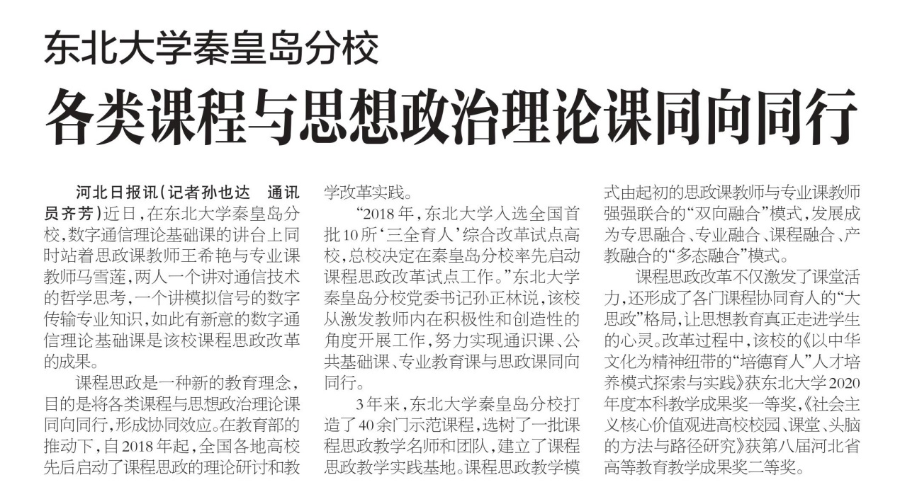河北日报讯(记者孙也达 通讯员齐芳)近日,在太阳成集团tyc33455秦皇岛分校,数字通信理论基础课的讲台上同时站着思政课教师王希艳与专业课教师马雪莲,两人一个讲对通信技术的哲学思考,一个讲模拟信号的数字传输专业知识,如此有新意的数字通信理论基础课是该校课程思政改革的成果。