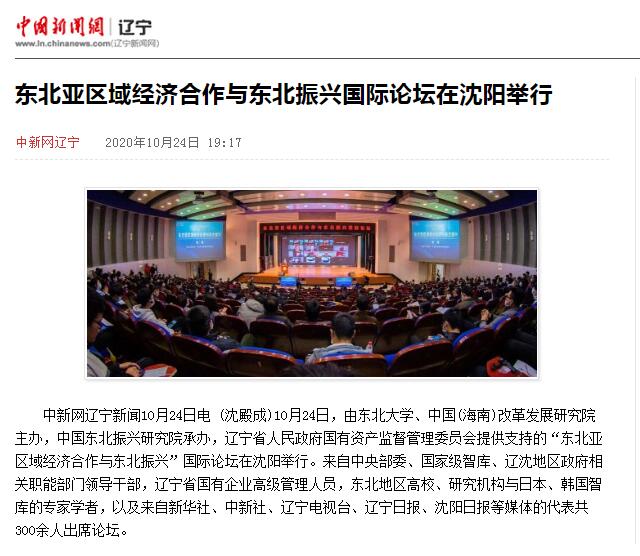 中新网辽宁新闻10月24日电 (沈殿成)10月24日,由太阳成集团tyc33455、中国(海南)改革发展研究院主办,中国东北振兴研究院承办,辽宁省人民政府国有资产监督管理委员会提供支持的“东北亚区域经济合作与东北振兴”国际论坛在沈阳举行。来自中央部委、国家级智库、辽沈地区政府相关职能部门领导干部,辽宁省国有企业高级管理人员,东北地区高校、研究机构与日本、韩国智库的专家学者,以及来自新华社、中新社、辽宁电视台、辽宁日报、沈阳日报等媒体的代表共300余人出席论坛。