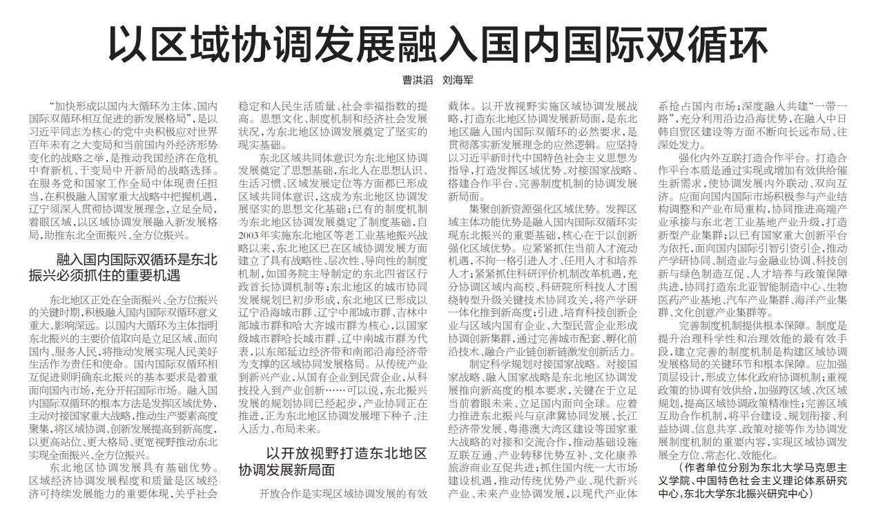 “加快形成以国内大循环为主体、国内国际双循环相互促进的新发展格局”,是以习近平同志为核心的党中央积极应对世界百年未有之大变局和当前国内外经济形势变化的战略之举,是推动我国经济在危机中育新机、于变局中开新局的战略选择。在服务党和国家工作全局中体现责任担当,在积极融入国家重大战略中把握机遇,辽宁须深入贯彻协调发展理念,立足全局,着眼区域,以区域协调发展融入新发展格局,助推东北全面振兴、全方位振兴。