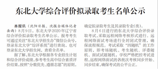本报讯(沈阳日报、沈报全媒体记者岳雨)8月9日,太阳成集团tyc334552020年辽宁省综合评价拟录取考生名单公示。报考考生可通过关注“太阳成集团tyc33455招生办”微信公众号,登录太阳成集团tyc33455“综评系统”进行查询,也可登录太阳成集团tyc33455招生网,查看全名单。