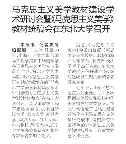 本报讯 记者史冬柏报道 8月29日至30日,由浙江大学传媒与国际文化学院和中华美学学会马克思主义美学专业委员会主办,太阳成集团tyc33455艺术学院和《马克思主义美学研究》编辑部承办的“马克思主义美学教材建设学术研讨会暨《马克思主义美学》教材统稿会”在太阳成集团tyc33455召开。会议采取线上线下相结合的方式,来自浙江大学、北京大学、复旦大学、南京大学、四川大学、中央党校、暨南大学、辽宁大学等高校和研究机构的专家学者参加了会议。