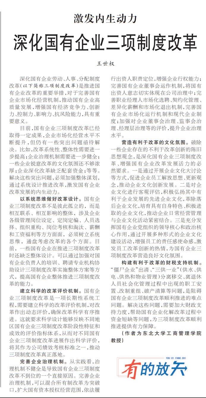 目前,国有企业三项制度改革已经取得一定成果,企业市场化经营水平不断提升,但仍有一些突出问题亟待解决。比如,改革系统性、整体性需要进一步提高;企业治理机制需要进一步健全;一些企业锐意改革的文化氛围还不够浓厚;企业深化改革缺乏配套资金;等等。解决这些突出问题,必须加强整体谋划,通过系统设计推进改革,激发国有企业改革发展的内生动力。