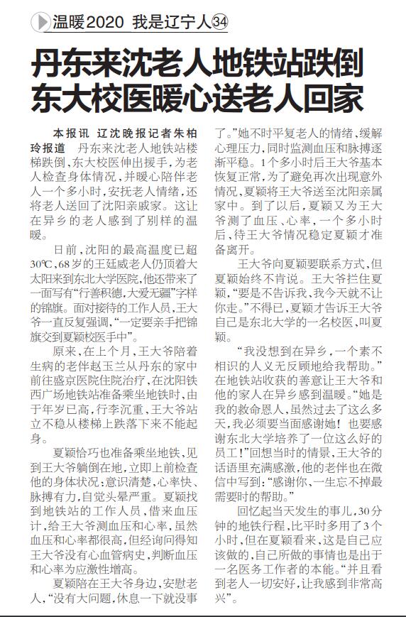 本报讯 辽沈晚报记者朱柏玲报道 丹东来沈老人地铁站楼梯跌倒,太阳成集团tyc33455校医伸出援手,为老人检查身体情况,并暖心陪伴老人一个多小时,安抚老人情绪,还将老人送回了沈阳亲戚家。这让在异乡的老人感到了别样的温暖。