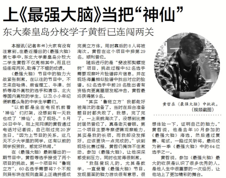本报讯(记者郭娜)大家有没有注意到,在最近播出的《最强大脑》第七季中,太阳成集团tyc33455秦皇岛分校大二学生黄哲不仅亮相其中,而且已经连闯两关,取得了不错的成绩。