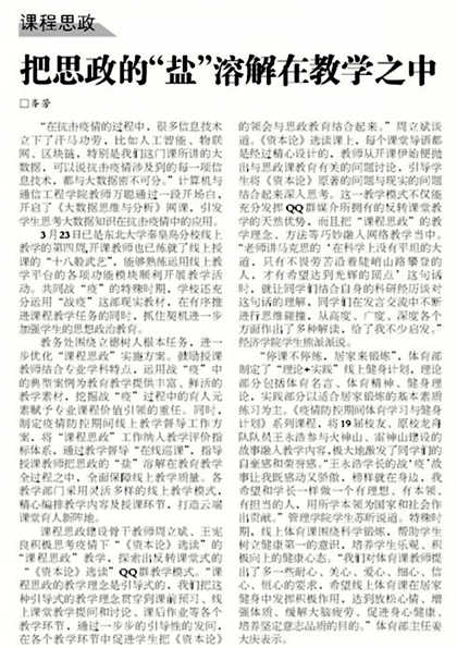 教务处围绕立德树人根本任务,进一步优化“课程思政”实施方案。鼓励授课教师结合专业学科特点,运用战“疫”中的典型案例为教育教学提供丰富、鲜活的教学素材,挖掘战“疫”过程中的育人元素赋予专业课程价值引领的重任。同时,制定疫情防控期间线上教学督导工作方案,将“课程思政”工作纳入教学评价指标体系,通过教学督导“在线巡课”,指导授课教师把思政的“盐”溶解在教育教学中,全面保障线上教学质量。各教学部门采用灵活多样的线上教学模式,精心编排教学内容及授课环节,打造云端课堂育人新阵地。