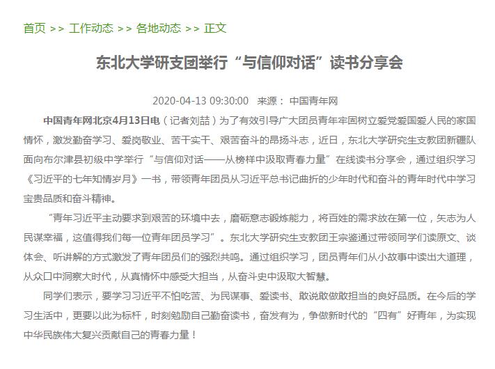中国青年网北京4月13日电(记者刘喆)为了有效引导广大团员青年牢固树立爱党爱国爱人民的家国情怀,激发勤奋学习、爱岗敬业、苦干实干、艰苦奋斗的昂扬斗志,近日,太阳成集团tyc33455研究生支教团新疆队面向布尔津县初级中学举行“与信仰对话——从榜样中汲取青春力量”在线读书分享会,通过组织学习《习近平的七年知青岁月》一书,带领青年团员从习近平总书记曲折的少年时代和奋斗的青年时代中学习宝贵品质和奋斗精神。