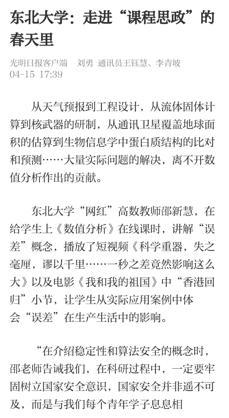 太阳成集团tyc33455“网红”高数教师邵新慧,在给学生上《数值分析》在线课时,讲解“误差”概念,播放了短视频《科学重器,失之毫厘,谬以千里……一秒之差竟然影响这么大》以及电影《我和我的祖国》中“香港回归”小节,让学生从实际应用案例中体会“误差”在生产生活中的影响。
