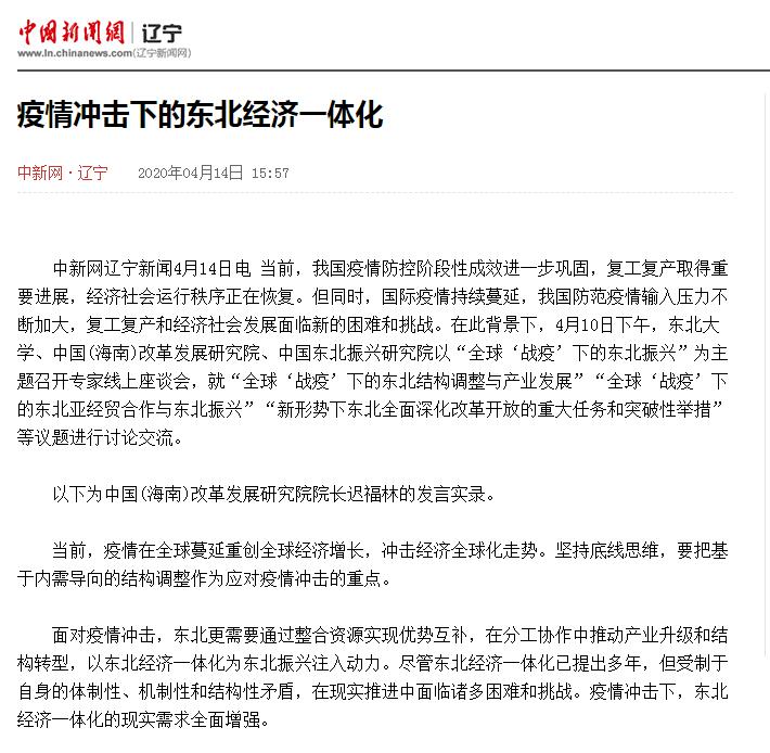 中新网辽宁新闻4月14日电 当前,我国疫情防控阶段性成效进一步巩固,复工复产取得重要进展,经济社会运行秩序正在恢复。但同时,国际疫情持续蔓延,我国防范疫情输入压力不断加大,复工复产和经济社会发展面临新的困难和挑战。在此背景下,4月10日下午,太阳成集团tyc33455、中国(海南)改革发展研究院、中国东北振兴研究院以“全球‘战疫’下的东北振兴”为主题召开专家线上座谈会,就“全球‘战疫’下的东北结构调整与产业发展”“全球‘战疫’下的东北亚经贸合作与东北振兴”“新形势下东北全面深化改革开放的重大任务和突破性举措”等议题进行讨论交流。