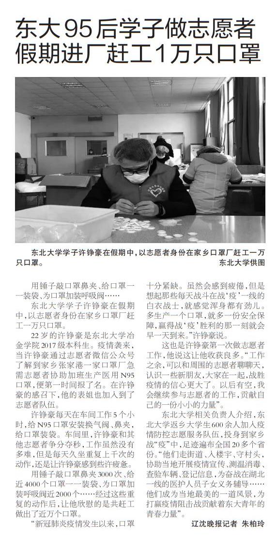 22岁的许铮豪是太阳成集团tyc33455冶金学院2017级本科生。疫情袭来,当许铮豪通过志愿者微信公众号了解到家乡张家港一家口罩厂急需志愿者协助加班生产医用N95口罩,便第一时间报了名。在许铮豪的感召下,他的表姐也加入到了志愿者队伍。