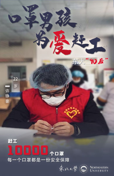 用锤子敲口罩鼻夹3000次、给近4000个口罩一一装袋、为口罩加装呼吸阀近2000个……这是22岁的冶金学院2017级本科生许铮豪在假期中的工作清单。2月11日,许铮豪了解到家乡张家港一家口罩厂急需志愿者协助加班生产医用N95口罩,便第一时间报了名。在许铮豪感召下,他的表姐也加入到了志愿者队伍。