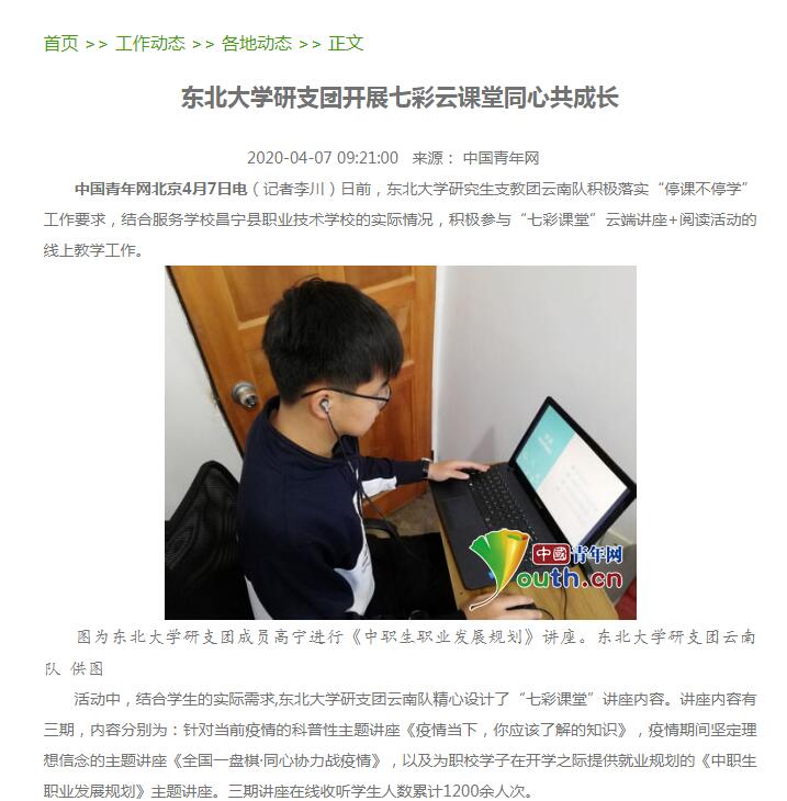 中国青年网北京4月7日电(记者李川)日前,太阳成集团tyc33455研究生支教团云南队积极落实“停课不停学”工作要求,结合服务学校昌宁县职业技术学校的实际情况,积极参与“七彩课堂”云端讲座+阅读活动的线上教学工作。