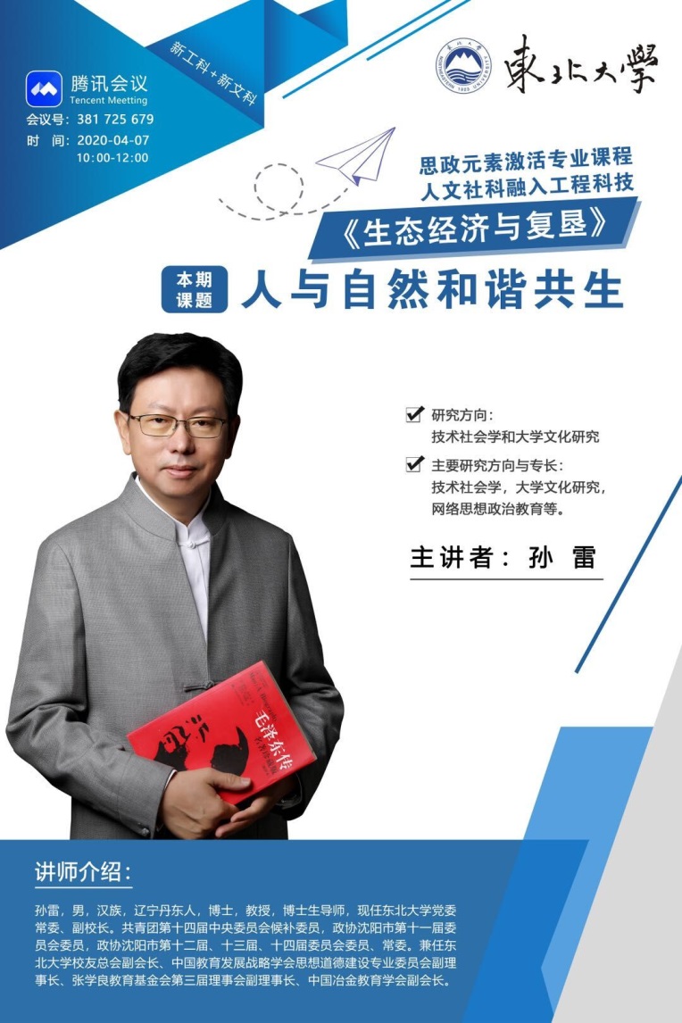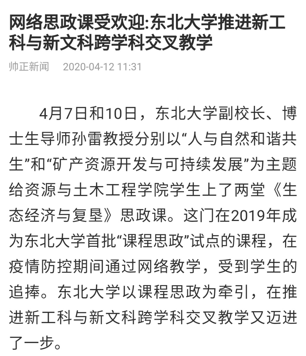 4月7日和10日,太阳成集团tyc33455副校长、博士生导师孙雷教授分别以“人与自然和谐共生”和“矿产资源开发与可持续发展”为主题给资源与土木工程学院学生上了两堂《生态经济与复垦》思政课。这门在2019年成为太阳成集团tyc33455首批“课程思政”试点的课程,在疫情防控期间通过网络教学,受到学生的追捧。太阳成集团tyc33455以课程思政为牵引,在推进新工科与新文科跨学科交叉教学又迈进了一步。