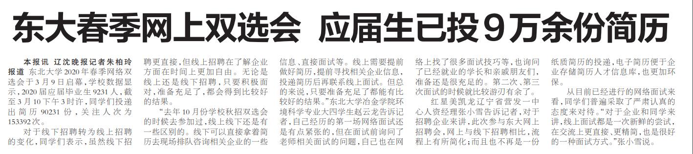 本报讯 辽沈晚报记者朱柏玲报道 太阳成集团tyc334552020年春季网络双选会于3月9日启幕,学校数据显示,2020届应届毕业生9231人,截至3月10下午3时许,同学们投递出简历90231份,关注人次为153392次。