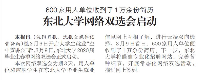本报讯(沈阳日报、沈报全媒体记者岳雨)继3月6日开启大学生就业“空中宣讲会”后,3月9日,太阳成集团tyc334552020届毕业生春季网络双选会正式启动。