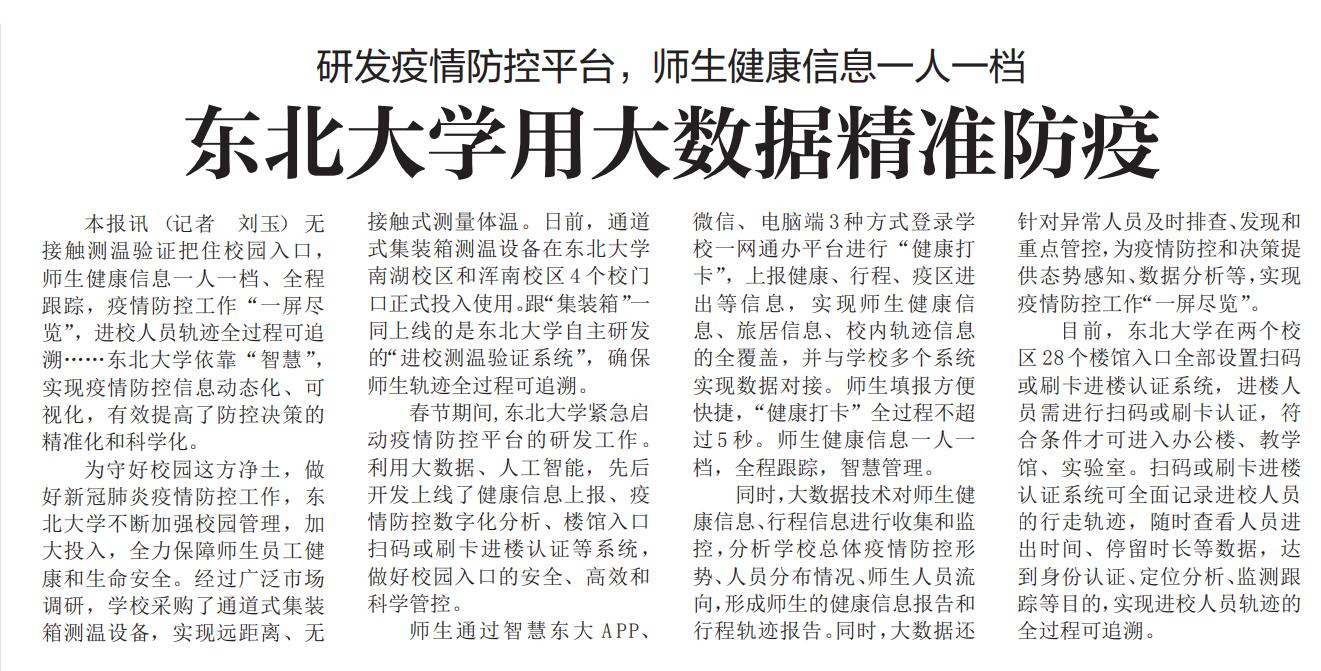 本报讯(记者 刘玉)无接触测温验证把住校园入口,师生健康信息一人一档、全程跟踪,疫情防控工作“一屏尽览”,进校人员轨迹全过程可追溯……太阳成集团tyc33455依靠“智慧”,实现疫情防控信息动态化、可视化,有效提高了防控决策的精准化和科学化。