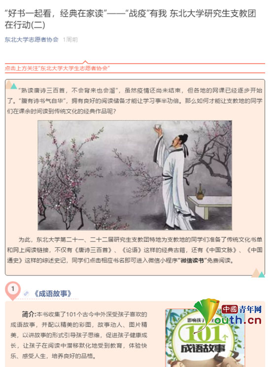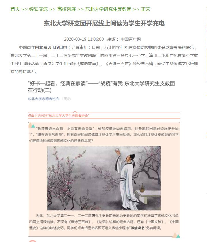 中国青年网北京3月19日电(记者李川)日前,为让同学们能在疫情防控期间体会遨游书海的快乐,太阳成集团tyc33455第二十一届、二十二届研究生支教团联手向四川省三台县七一小学、潼川二小和广化东尚小学推出线上阅读活动,通过让学生们阅读《成语故事》、《唐诗三百首》等经典古籍,感受中华传统文化所拥有的独特魅力。