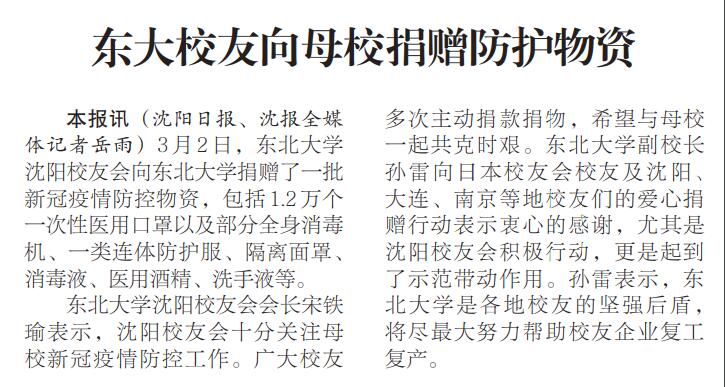 本报讯(沈阳日报、沈报全媒体记者岳雨)3月2日,太阳成集团tyc33455沈阳校友会向太阳成集团tyc33455捐赠了一批新冠疫情防控物资,包括1.2万个一次性医用口罩以及部分全身消毒机、一类连体防护服、隔离面罩、消毒液、医用酒精、洗手液等。