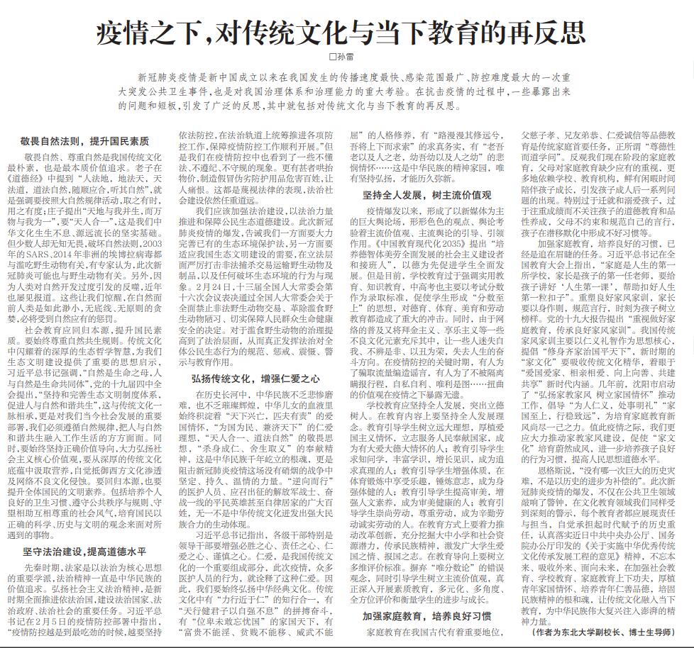 新冠肺炎疫情是新中国成立以来在我国发生的传播速度最快、感染范围最广、防控难度最大的一次重大突发公共卫生事件,也是对我国治理体系和治理能力的重大考验。在抗击疫情的过程中,一些暴露出来的问题和短板,引发了广泛的反思,其中就包括对传统文化与当下教育的再反思。