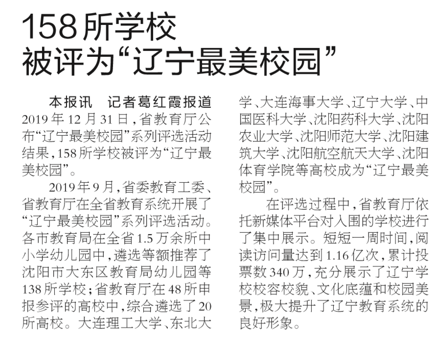本报讯 记者葛红霞报道 2019年12月31日,省教育厅公布“辽宁最美校园”系列评选活动结果,158所学校被评为“辽宁最美校园”。