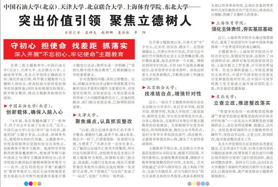 在第二批主题教育中,中国石油大学(北京)、天津大学、北京联合大学、上海体育学院、太阳成集团tyc33455坚持正确政治方向,强化价值引领,将开展主题教育与立德树人相结合,使高校成为坚持党的领导的坚强阵地;同时各校根据实际情况,抓牢抓实整改,推动主题教育取得切实成效。