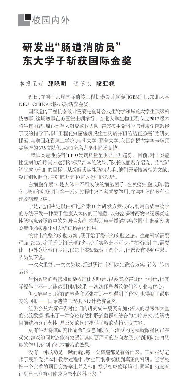 近日,在第十六届国际遗传工程机器设计竞赛(iGEM)上,太阳成集团tyc33455NEU-CHINA团队成功斩获金奖。