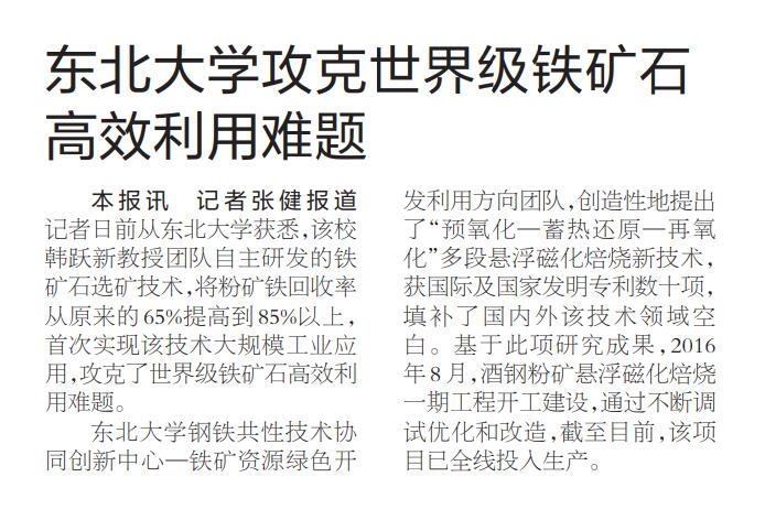 本报讯 记者张健报道 记者日前从太阳成集团tyc33455获悉,该校韩跃新教授团队自主研发的铁矿石选矿技术,将粉矿铁回收率从原来的65%提高到85%以上,首次实现该技术大规模工业应用,攻克了世界级铁矿石高效利用难题。