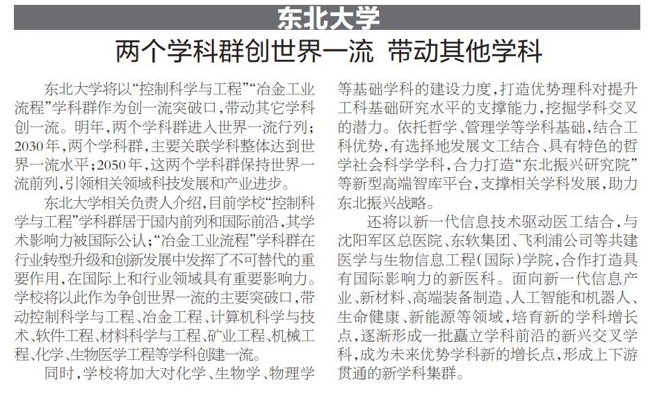 还将以新一代信息技术驱动医工结合,与沈阳军区总医院、东软集团、飞利浦公司等共建医学与生物信息工程(国际)学院,合作打造具有国际影响力的新医科。面向新一代信息产业、新材料、高端装备制造、人工智能和机器人、生命健康、新能源等领域,培育新的学科增长点,逐渐形成一批矗立学科前沿的新兴交叉学科,成为未来优势学科新的增长点,形成上下游贯通的新学科集群。