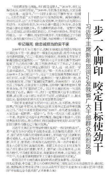 我们都在努力奔跑,我们都是追梦人。”“2018年,我们过得很充实、走得很坚定。”“2019年,有机遇也有挑战,大家还要一起拼搏、一起奋斗。”……国家主席习近平新年贺词一经播出,立即在我省广大干部群众中引发热烈反响。真挚的情感,亲切的话语,让广大干部群众备受鼓舞,对美好生活充满信心和期待。大家纷纷表示,2019年是新中国成立70周年,是全面建成小康社会关键之年。作为新时代的奋斗者,一定要牢记嘱托,立足岗位,以坚如磐石的信心、只争朝夕的劲头、坚韧不拔的毅力,一步一个脚印,咬定目标使劲干,为加快推进辽宁全面振兴、全方位振兴作出自己的贡献,为新中国七十华诞献礼。