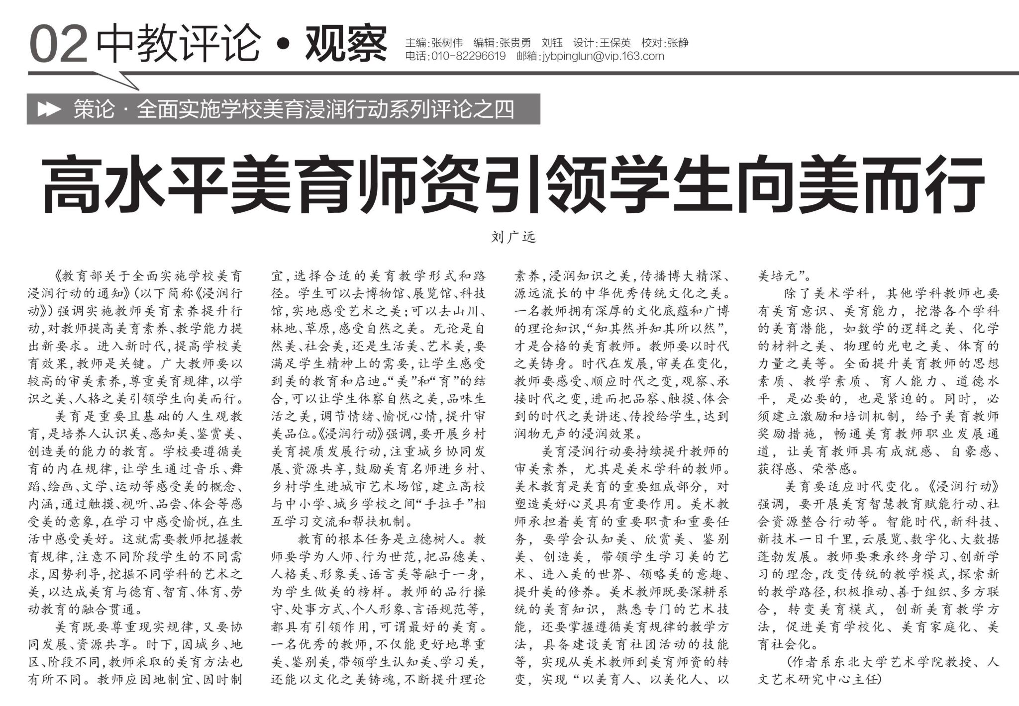 教育部关于全面实施学校美育浸润行动的通知》(以下简称《浸润行动》)强调实施教师美育素养提升行动,对教师提高美育素养、教学能力提出新要求。进入新时代,提高学校美育效果,教师是关键。广大教师要以较高的审美素养,尊重美育规律,以学识之美、人格之美引领学生向美而行。