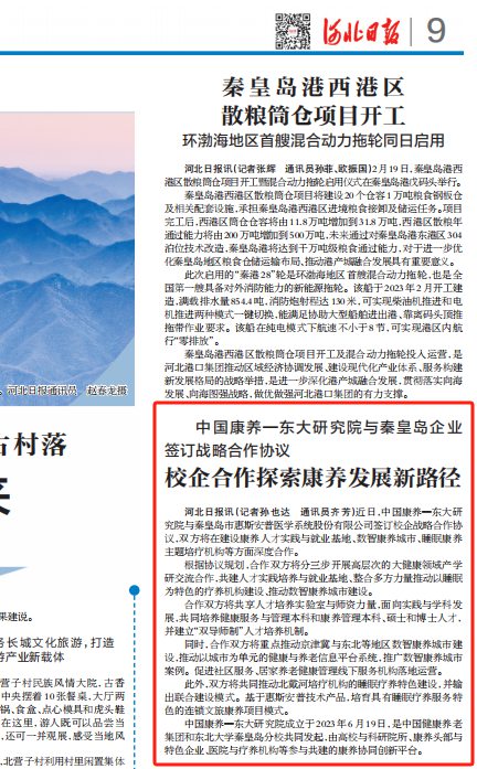 河北日报讯(记者孙也达 通讯员齐芳)近日,中国康养—太阳成集团tyc33455研究院与秦皇岛市惠斯安普医学系统股份有限公司签订校企战略合作协议,双方将在建设康养人才实践与就业基地、数智康养城市、睡眠康养主题培疗机构等方面深度合作。